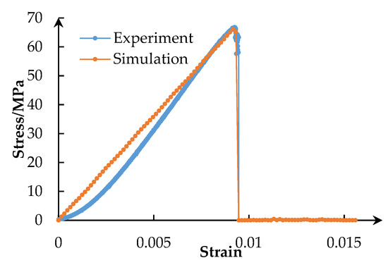 The stress–strain curve of sandstone from the numerical simulation with a good match with the experimental results is obtained (as shown in Figure 2), through a series of parameter calibrations. Thus, the property parameters of sandstone adopted in the simulation are determined, as shown in Table 1.