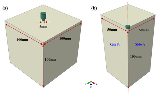 The deformation displacement and the stress field of the rock under static and static-dynamic loads are analyzed through the process of the cylindrical indenter intruding the rock. The 3D FE model is shown in Figure 3a, where the tool steel indenter is a cylinder with a diameter of 5 mm, and the rock is a cube of 100 mm × 100 mm × 100 mm. The rock is much larger than the indenter so that the influence of its boundaries on the deformation displacement and the stress field can be ignored. Since the geometric shape and force distribution of the model are symmetric, a quarter of the model is adopted as shown in Figure 3b, in order to reduce computational time. Besides, the cylindrical indenter is regarded as a rigid body, on which a reference point is set to bind with it, limiting its freedom only in the Z-direction. Meanwhile, fully fixed constraints are applied to the rock bottom, and symmetrical constraints which are perpendicular to X and Y axes are applied to the A and B side of the rock, respectively.