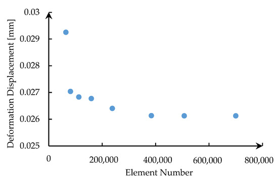 As the results of the FE model are highly sensitive to mesh size, mesh size sensitivity analysis is conducted to minimize the influence of the grid size on the results. The model was run with various numbers of elements and the deformation displacements of the same point on the rock surface under static load are compared to each other.