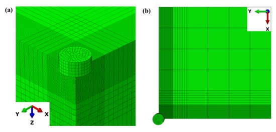 The 3D finite element model: (a) The whole model. (b) A quarter of the model.