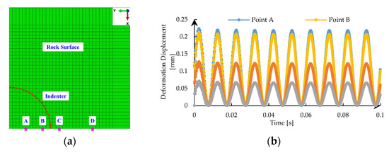 A static load of 1 kN and a harmonic dynamic load with an amplitude of 1 kN and a frequency of 100 Hz are applied to the rock, and the deformation displacements of the rock under the static-dynamic loads are compared. In Figure 6a, the contact area between the cylindrical indenter and the rock has been circled with a dotted red line. Four points on the surface of the rock have been selected, among which points A and B are below the indenter, point C is near the indenter and point D is away from the indenter.