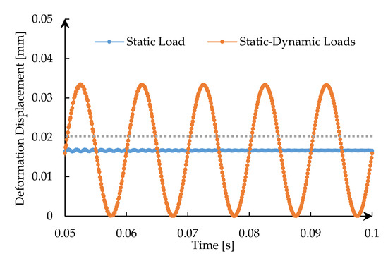 Compared with the static load, the static-dynamic loads are equivalent to adding a dynamic load which changes periodically with time. For a certain moment, it can still be regarded as a static load problem with the superposition of two loads. Therefore, Equations (1) and (2) are still applicable to these static-dynamic loads’ problem, just replace the q with q + q(t), where q(t) is the dynamic load per unit area. That is why similar results are obtained from static and static-dynamic loads conditions.