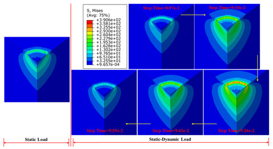 The comparison of 3D Mises stress contour plots under static and static-dynamic loads for cylindrical indenter during an impact period.
