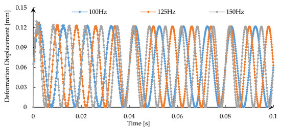 The frequency of dynamic load is one major parameter that could influence the deformation displacement and the stress field of the rock under the cylindrical indenter. Therefore, a constant static load of 1 kN and a dynamic load of 1 kN with the frequencies of 100 Hz, 125 Hz and 150 Hz, are applied to the rock in the three simulations.