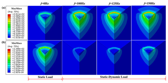 The comparison of Mises stress contour plots under static and static-dynamic loads with different frequencies of dynamic load for cylindrical indenter: (a) MaxMises. (b) MinMises.