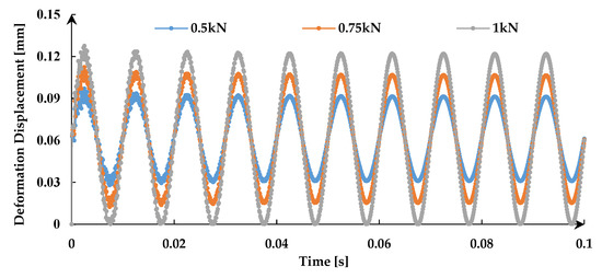 The deformation displacement is simulated for the varying amplitude of dynamic load giving the results shown in Figure 11. The magnitude of deformation displacement of the rock increases with the increase of the amplitude of dynamic load, but the frequency of fluctuations of the deformation displacement does not change. The greater the amplitude of dynamic load is, the more serious the deformation of the rock is, which is more conducive to rock fracture. However, it is worth noting that the amplitude of dynamic load cannot be increased optionally, its maximum value needs to be less than or equal to the static load. This is because if the dynamic load is greater than the static load, the indenter would be lifted at some time instead of intruding the rock, which is unfavorable for the rock fragmentation. In addition, it can be also concluded that the rock can be broken even under a smaller static load because the dynamic load would aggravate the deformation of the rock on the basis of static load, which implies that for drilling application, a smaller weight on the bit can be allowed when drilling under the static-dynamic loads.