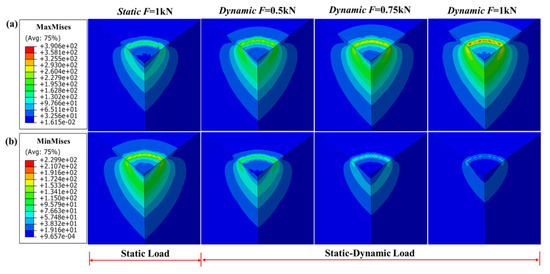The comparison of Mises stress contour plots under static and static-dynamic loads with different amplitudes of dynamic load for cylindrical indenter: (a) MaxMises. (b) MinMises.