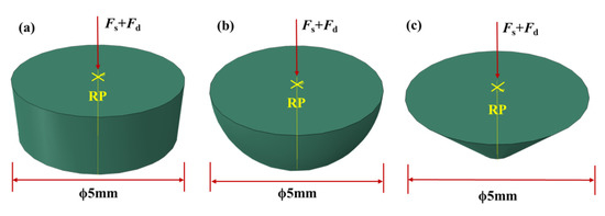 3D finite element models of indenters: (a) cylinder; (b) sphere; (c) cone. RP, Fs and Fd represent the reference point, static and dynamic load, respectively.