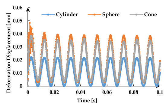 In addition to the cylindrical indenter, the spherical and conical indenters are also common types of indenters. Therefore, in order to study the influence of the type of indenter on the deformation displacement and stress field of the rock under static-dynamic loads, the same numerical simulations are carried out by replacing the indenter in sequence. As shown in Figure 13, these three kinds of indenters have a diameter of 5 mm, and a reference point PR is set at the center of the upper surface of each indenter, which is also the position applied by static-dynamic loads. Besides, in order to satisfy the conditions for the convergence of the three models, the static load applied is 100 N and the harmonic dynamic load is 100 N, with a frequency of 100 Hz.