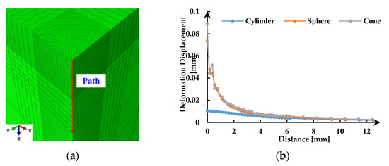 Comparison of deformation displacement of three types of indenters under static-dynamic loads: (a) The selected path in the vertical direction of the rock. (b) Deformation displacement versus distance from the rock surface.