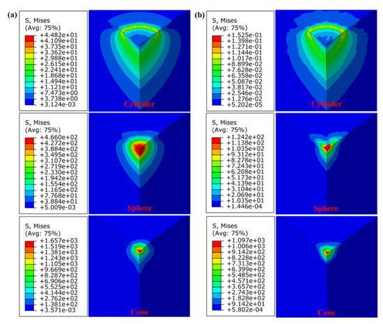 Comparison of the stress field for three types of indenters under static-dynamic loads: (a) Maximum Mises. (b) Minimum Mises. As there are large differences between the maximum and minimum stress for the three types of indenters, the uniform legend is not applicable here. Please note the color code for each experiment which present maximum and minimum stress for each figure.