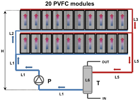The system under investigation has been already described in previous works by the authors [24,25]. In particular, in [25], the single photovoltaic system with active fluid cooling (PVFC) was studied both theoretically and experimentally by using a one-dimensional thermal model. In the following, a short description is reported and further details can be found in [25].