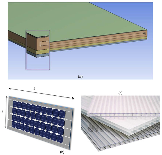 (a) Sketch of the PVFC module (height of the module = 1.42 m, i.e., the water duct length; width of the water duct l = 0.6 m, height of the module s = 0.0363 m). (b) Layer of 40 series-connected m-Si solar cells with an anti-reflective coating. The PV cells are distributed over 4 columns and 10 rows for a total height of 1.22 m. (c) Particular alveolar polycarbonate ducts, each of them of = 1.42 m.