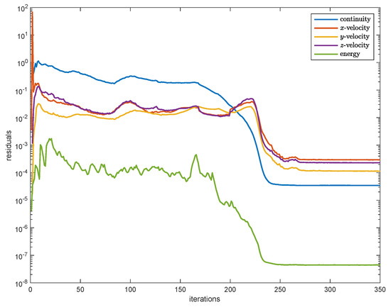 The module was discretized by considering unstructured meshes for the m-Si cells and for the cooling fluid and structured meshes for the other components of the module. In particular, a grid sensitivity study was carried out to demonstrate grid-independent and grid-convergent results, checking both solutions and residual values. In fact, in order to guarantee the solution accuracy, numerical results obtained over a range of significantly different grid resolutions were obtained. Relative errors of cell and fluid temperature fields and of integrated quantities such as average electric efficiencies were calculated. The final grid selected (690,366 nodes and 408,960 elements) guarantees the solution accuracy (maximum relative error of less than 2%). Figure 3 shows the scaled residuals [27] of the continuity, momentum, and energy equations of a simulation when the steady-state solution is reached for a case study during July in Catania (Southern Italy), with orientation SOUTH and tilt 33.