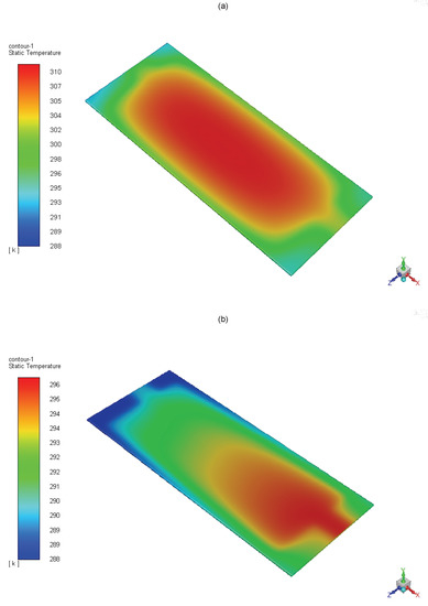 Spatial distribution of the cell temperature when = 0 (a) and 1000 L/h (b). Simulations were performed during an average day of July in Catania (Southern Italy), with orientation SOUTH and tilt 33. and axes are swapped in CFD simulations.