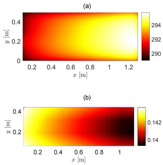 Spatial distribution of (a) the cell temperature, , and of (b) the electrical performance, , for = 1000 L/h.