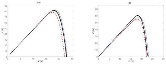 Electrical power of a PV module obtained experimentally (black lines) in Turin (Northern Italy) and by solving the one- (dashed red lines) and the three-dimensional (dotted blue lines) models when the cooling is active (in (a) Flow rate of 30 L/h, G = 1023 W m, = 287.45 K; in (b) Flow rate of 52 L/h, G = 700 W m, = 288.15 K). In both conditions, the measured water temperature = 294.45 K.