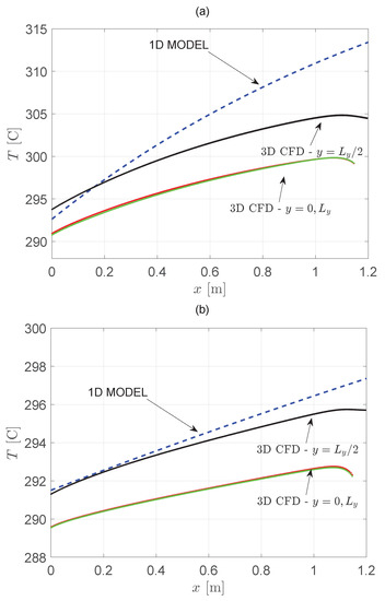 Figure 11 shows the spatial distribution of the cooling fluid temperature in the case of = 600 L/h in Catania (in July). The results of the three-dimensional model are reported at different z in order to show the thermal gradients inside the ducts, and are compared with the temperature profile obtained with the one-dimensional model reported in [25]. The agreement between the results obtained by solving the 1D and 3D numerical models for the case = 600 L/h is good.