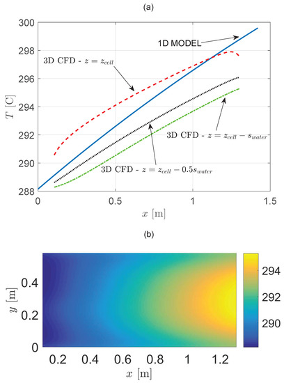 Spatial distribution of the cooling fluid temperature for = 600 L/h. In (a), temperatures of the three-dimensional model at different z and at are compared with the temperature profile obtained with the one-dimensional model (dashed line). In (b), the distribution of the cooling fluid temperature in is reported. Simulations were performed during an average day of July in Catania (Southern Italy), with orientation SOUTH and tilt 33.