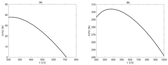 The net power gain depends on the power consumption that, for the case considered here, ranges between for to 130 W at 1000 L/h [24]. By using a statistical approach for climate data (i.e., PVGIS), an optimum coolant flow rate can be estimated for every month by calculating the maximum of the net power gain , obtained by combining Equations (8) and (10). Figure 12 shows that there is an optimal value of coolant flow rate for the NPG, which represents the best compromise inside the competitive mechanism between the pump consumption and the power gain due to the cell temperature reduction. The results obtained in Catania city show that, in July, the optimum flow rate is reached at around 400 L/h (20 L/h for each module), while it is reached at around 200 L/h in January due to the lower ambient temperature.