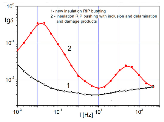 In off-line RIP insulation tests, the presence of Maxwell–Wagner charge as well as inclusion and delamination can be identified, among others, using the spectroscopic measurements of dielectric relaxation. In the frequency domain, the most frequently used method is FDS (Frequency Dielectric Spectroscopy) method, in which changes in the dielectric loss factor tgδ in a wide frequency range of 10−4–103 Hz are noticed (Figure 3).