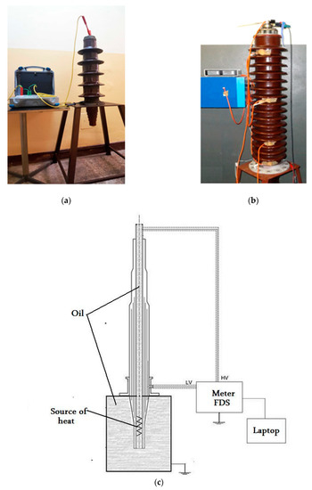 The experimental setup for: (a) CRPT bushing; (b) CTKF bushing, (c) diagnostic scheme of the Frequency Dielectric Spectroscopy (FDS) method.