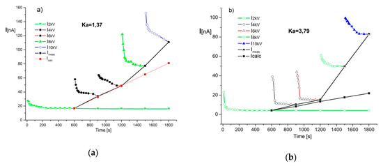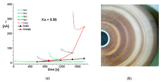The SVM tests were performed directly after the deinstallation of bushings and after 140, 340 and 740 h of aging. The instrument used for measurements was an MI 3200 Metrel Theraohm at a voltage of 10 kV and measurement accuracy current of 5% ± 0.5 nA in the full measurement range. The voltage levels and the respective time sequences used in this procedure are presented in Table 1. The combined test time was 30 min, and after its conclusion, the Ka coefficient was calculated.
