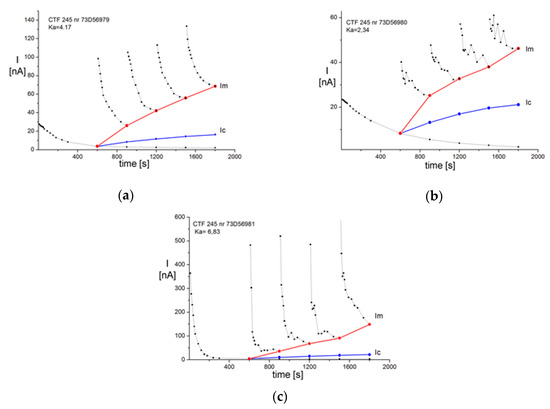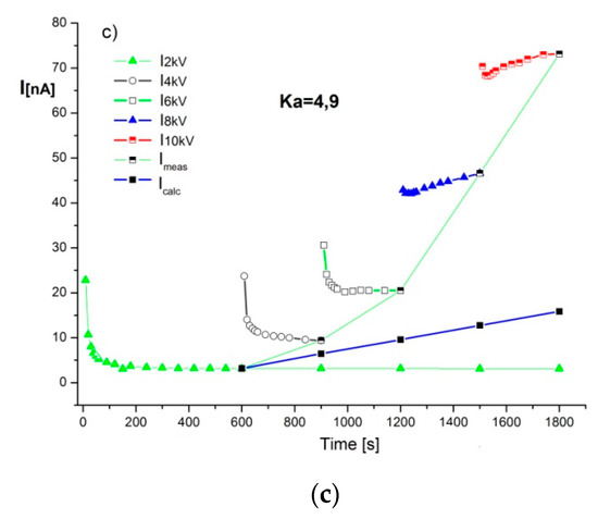 Figure 5 shows the effects of thermal aging on the SVM measurement results for the RBP insulated type CRPT 52 kV bushing [16]. After 10 years of operation, the absorption coefficient value was Ka = 1.37 (Figure 5a), which suggests a good overall condition without advanced aging processes. After 340 and 740 h of aging, a significant increase in the leakage current was observed for the step voltages of 8 and 10 kV. As a result, the calculated absorption coefficient values were Ka = 3.79 (Figure 5b) and Ka = 4.9 (Figure 5c), respectively. These results may be considered to be a result of the ongoing aging process, which leads to the presence of the products of the thermal decomposition.