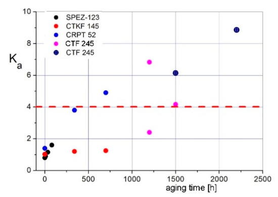 Considering the much higher thermal endurance of RIP type composites over the RBP type, which are classified respectively as class F (155 °C) and E (120 °C), the obtained data of coefficient Ka changes during the aging process were as expected in both cases.