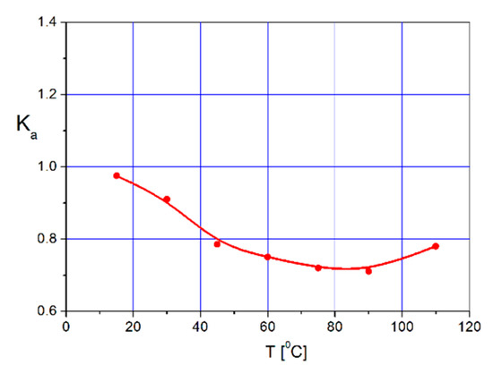 Since temperature is a crucial factor influencing the dielectric response characteristic of insulation, it needs to be taken into consideration during analysis. This issue also concerns the SVM tests, as the temperature of the bushings may influence the calculated value of the absorption coefficient Ka. This especially applies when measurements were taken in conditions of a big temperature difference within the bushings’ core. For this reason, an experiment was conducted to determine the dependence between temperature and Ka coefficient values. Measurements were taken for the temperature range of 15–110 °C. Figure 10 presents the Ka values as a function of temperature for the PTK 52 kV bushing. The absorption coefficient ranged in value from 0.7 to 0.98, which means that, for a temperature of ∆T = 95 °C, the relative changes of Ka amounted to around 40%. Considering that the impact of the temperature on the dissipation factor tgδ50Hz is much higher, the absorption coefficient Ka as a descriptor of the condition of insulation is much more temperature-independent compared to the dielectric loss factor. Furthermore, Ka changes in a wide temperature range, classifying it within a certain range of criteria values for insulation assessment.