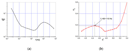 The dependencies measured in the CTF 245 kV bushing: (a) tgδ = f(f); (b) ε’’ = f(ε’).