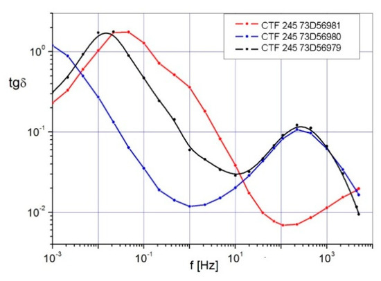 The frequency characteristics of the dissipation factor tgδ of the selected CTF 245 kV bushings are presented in Figure 12. In all cases, the shape of the response characteristics was typical for insulation in the advanced degradation process. Additional relaxation processes were observed both in high (HF) and low (LF) frequencies, which suggest the presence of the products of the composite decomposition or the potential delamination of the layers. The relaxation in the high-frequency range in all bushings shows that a thermal decomposition of resin or paper had already begun on the screen–insulation boundary.