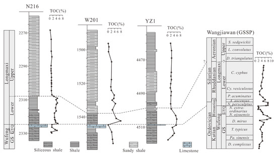 Stratigraphic correlation between the boreholes studied and the Wangjiawan section (GSSP) in Yichang, Hubei Province. The paleontological data of the Wangjiawan section are from Chen et al. [20], and the total organic carbon content curve is from Yan et al. [3].