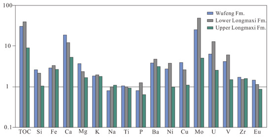 The TOC and elements involved in the study were relative to the enrichment factors (EF) of the average shale. The line of EFaverage = 1 divides the enrichment or loss of elements.