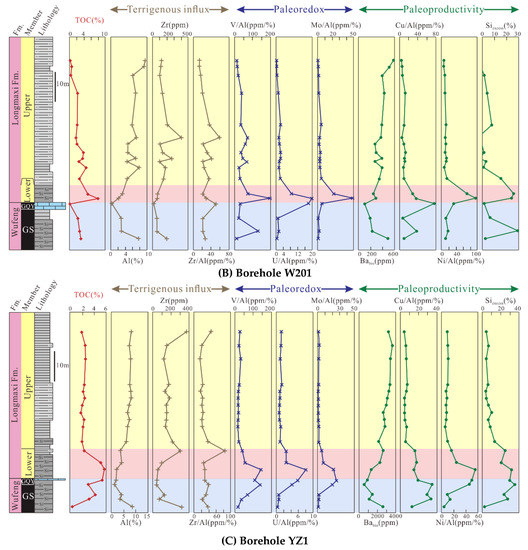 The various parameters for terrigenous influx indicate that during the deposition of the Wufeng Formation, the terrigenous influx in the Upper Yangtze region was moderate but fluctuating, which was caused by rapid regression events and/or structural controls. During the deposition of the top of the Wufeng Formation to the lower part of the Longmaxi Formation, the terrigenous influx always maintained low values, reflecting a rising sea level and a stable sedimentary environment. Afterward, a regression occurred again, and the terrigenous influx of the Upper Longmaxi Formation gradually increased. There was a negative correlation between terrigenous influx and TOC in the Longmaxi Formation (Figure 5), indicating that terrigenous influx had a significant dilution effect on organic matter content. As for the Wufeng Formation, however, in addition to the YZ1, the data of the W201 and the N216 were relatively discrete, and there seems to be no obvious correlation between TOC and proxies for terrigenous influx. The result suggests the accumulation mechanism of organic matter was more complicated during this period, and paleoproductivity and redox condition also influenced the accumulation of organic matter.