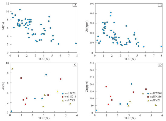 The Al and Zr concentration curves of the Wufeng shale suggest moderate and variable terrigenous influx. In the shale of the Lower Longmaxi Formation, the concentration of Al and Zr was relatively low, indicating a relatively stable sedimentary environment and an overall less terrigenous supply during this period. During the deposition of the Upper Longmaxi Formation, the concentration of Al and Zr increased gradually, suggesting a significant increase in terrigenous influx. In addition, the concentration of Al in the Upper Longmaxi shale of the N216 and the W201 kept rising, and the Zr content and Zr/Al values began to decline. Considering that the input of the terrigenous coarse-grain materials were relatively stable during this period [16], it is inferred that the increased supply of fine-grained minerals diluted the coarser components.