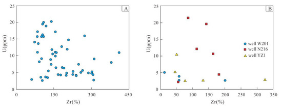 Cross plot of U and Zr. The data in (A) are from the Longmaxi Formation, and the data in (B) are from the Wufeng Formation.