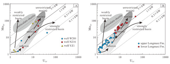 Cross plot of MoEF and UEF. The data in (A) are from the Wufeng Formation, and the data in (B) are from the Longmaxi Formation. The basic data are cited from Algeo and Tribovillard [11].