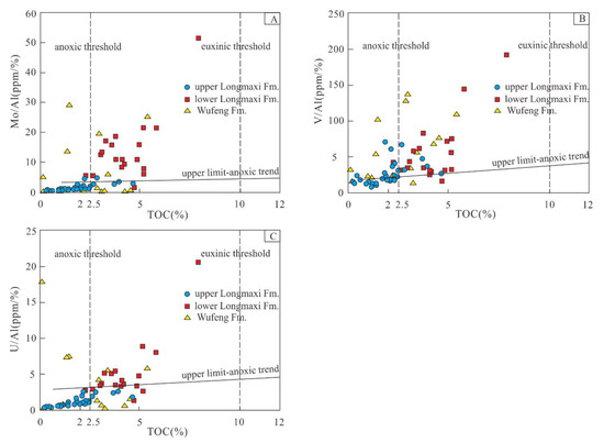 Cross plot of redox-sensitive trace elements and TOC. (A)Mo/Al vs. TOC; (B) V/Al vs. TOC; (C) U/Al vs. TOC. The data of anoxic threshold, euxinic threshold, and upper limit-anoxic trend are cited from Algeo and Maynard [13].