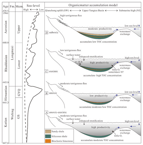 A global sea level decline and an extinction event occurred during the early Hirnantian Stage [18,26]. After the peak of glaciation, the glaciers began to melt and the sea level rose rapidly [5], and marine productivity recovered gradually. In the Early Silurian, relatively high sea levels continued to rise [5,26], and water stratification emerged. The correlation between the MoEF-UEF and the RSTEs-TOC indicates that euxinic water conditions occurred at that time, and the Yangtze Sea was still connected to the global ocean. Paleoproductivity reached the highest level, and formed a positive feedback system with reducing conditions, effectively maintaining or strengthening euxinic conditions. In addition, rising sea level reduced terrigenous influx, resulting in further accumulation of organic matter. Therefore, lack of terrigenous influx, euxinic water, and high productivity controlled the deposition of organic-rich shales in the Lower Longmaxi Formation.