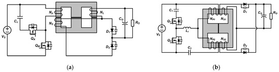 Conventional active-clamp-forward (ACF) converters with integrated magnetics. (a) Integration of a transformer and an output inductor [16]. (b) Integration of two transformers [17].