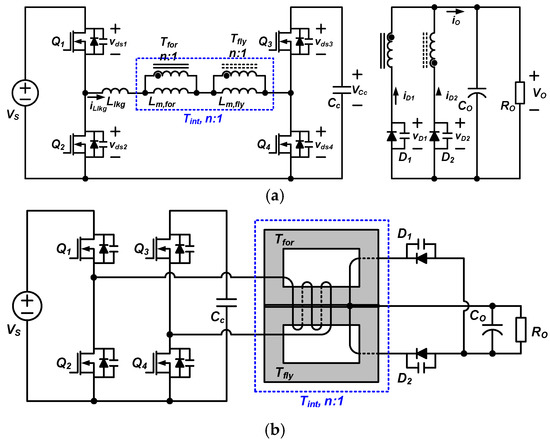 Proposed converter. (a) Circuit diagram. (b) Circuit diagram with a proposed integrated transformer.