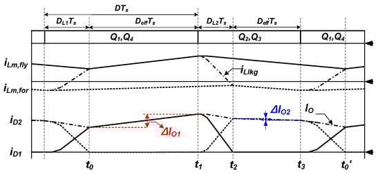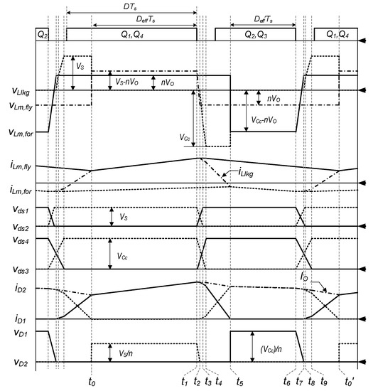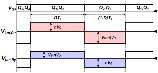 For simplifying analysis of the proposed converter, Llkg and the dead time among Q1–Q4 are ignored. In Figure 8, VS–nVO and –nVO are applied to the Lm,fly during DTS and (1–D)TS, respectively. Thus, the DC conversion ratio can be approximated as in (12) by the voltage second balance of Lm,fly.