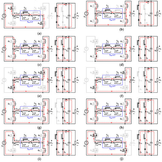 Topological state of proposed converter. (a) Mode 1 (t0–t1). (b) Mode 2 (t1–t2). (c) Mode 3 (t2–t3). (d) Mode 4 (t3–t4). (e) Mode 5 (t4–t5). (f) Mode 6 (t5–t6). (g) Mode 7 (t6–t7). (h) Mode 8 (t7–t8). (i) Mode 9 (t8–t9). (j) Mode 10 (t9–t0’).