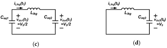 Mode 9 [t8–t9, Figure 6i]: After vds1 reaches to zero at t8, Mode 9 begins. In this mode, only Coss3 and Coss4 are continuously charged and discharged in accordance with the resonance with Llkg. As a result, vds4 is decreased to zero and vds3 is increased to VCc. The equivalent circuit of this mode is depicted in Figure 7d. Based on Mode 8 and Mode 9, the ZVS condition of Q1 and Q4 is: