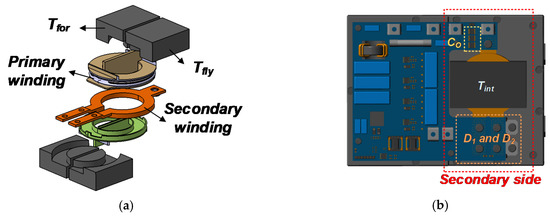 In this paper, by using a characteristic that the primary currents of the forward and flyback transformers are the same, an integrated transformer for Tfor and Tfly is proposed where two cores are separate and share the primary winding. In Figure 10, both the primary winding and secondary busbar are wound inside the core. As a result, the proposed integrated transformer can reduce the length of the transformer windings than those of the conventional integrated transformers in [16,17], which results in lower conduction loss of the transformer. Moreover, due to the windings wound inside the core, the proposed integrated transformer can have better EMI characteristics than the conventional integrated transformers [16,17]. Therefore, no additional shield is required in the proposed converter. In addition, as shown in Figure 10b, it is noted that the proposed converter can significantly simplify the secondary rectifier structure because the secondary busbar is directly connected to the output capacitor, which results in higher power density. Furthermore, there is no flux interference because two cores are separate from each other.