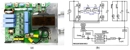 To regulate the output voltage, as shown in Figure 11b, the proposed converter used a DSP that is TMS320F28069PZT with 90 MHz clock frequency and 12-bit analog to digital conversion module. The DSP is used to implement the output voltage control and the switching frequency variation. The duty to output voltage transfer function of the proposed converter can be derived like a buck converter as follows: