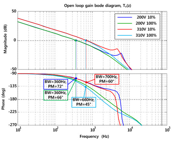 The loop gain (Tv(z)) of the proposed converter adopting the voltage compensator is illustrated in Figure 12. The voltage compensator (Gvc(z)) was designed for minimum 360 Hz bandwidth and 45° phase margin for the prototype of this paper.