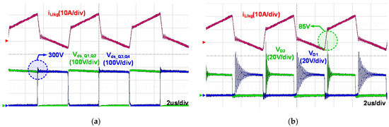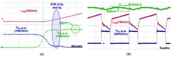 Figure 14 and Figure 15 present the key experimental waveforms at the minimum and maximum input voltage conditions under the full load condition. As shown in Figure 14, in the minimum input voltage condition (VS = 200 V), since the maximum switch voltage stresses are determined by the actual duty ratio that is sum of the effective duty ratio and the duty loss during the commutation period, the switching frequency varies from 150 kHz to 125 kHz at the minimum input voltage condition to reduce the ratio of the commutation period in the total switching period. As a result, the voltage stresses on the primary switches are well restricted near 400 V, and the secondary diode voltage stresses are under 100 V. Since the duty ratio (D) of the proposed converter can be designed to be over 0.5, the proposed converter well regulates the output voltage at the minimum input voltage condition with D = 0.605. Moreover, as can be seen in Figure 15, the voltage stresses on the switches and diodes are under 400 V and 100 V in the maximum input voltage condition (VS = 310 V). Although the voltage stresses on the switches and diodes varies according to the input voltage conditions, all of them are well controlled and restricted to be suitable for high performance Si-MOSFET with low cost and low on-resistance. Furthermore, the ZVS operation of the proposed converter is achieved even in the worst-case condition such as the high input voltage and full-load conditions shown in Figure 16a. Figure 16b shows the output voltage ripple of the proposed converter. The maximum output voltage ripple is under 500 mV regardless of the input voltage and load conditions (500 mV is the output voltage ripple requirement of LDC converter for vehicle applications). This verifies that the magnetizing inductances of the proposed integrated transformer is adequately designed and chosen. Thus, despite the integrated transformer, the proposed converter can effectively constrain the output current ripple.