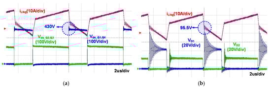 Figure 13 shows the experimental waveforms of the proposed converter at the nominal input voltage (VS = 270 V) and full-load condition with the 150 kHz switching frequency. As shown in Figure 13a, due to the ACF structure, there is no circulating current and only small commutation current occurs during the switch transition. Moreover, voltage stresses on the primary switches of the proposed converter is far lower than 650 V which is general breakdown voltage of high-performance Si-MOSFETs. As a result, the primary conduction loss of the proposed converter can be considerably reduced compared to the conventional PSFB converter. Moreover, the propose converter cuts the production cost by utilizing Si-MOSFETs and the integrated transformer with single and inside wounded primary and secondary windings.